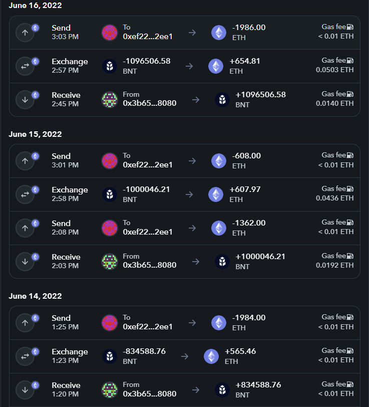If we look at the last 3 days we see the following pattern each day: Exit B3 withdraw queue receive ETH and BNT, Sell BNT for ETH, transfer ETH.